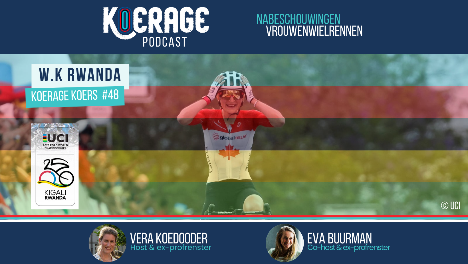 Daar zijn ze weer! Na de Tour de France Femmes was er even een tijdje pauze in de afgelopen 1,5 maand. Maar met de Wereldkampioenschappen wielrennen in Kigali, Rwanda werd het weer tijd voor een nabeschouwing! Voormalig professioneel wielrensters Vera Koedooder en Eva Buurman troffen elkaar online op de avond na het W.K. Weg voor de vrouwen voor Koerage Koers #48! Genoeg om over na te praten want na een vreemde wedstrijd won de jonge Canadese Magdeleine Vallieres en werd Nederland 5e en 7e met Riejanne Markus en Demi Vollering. Wat vonden Vera en Eva ervan dat het W.K in Rwanda plaats vond? En wat vonden ze van de koers? Wat waren voor hun de Koerage momenten? Veel luisterplezier!