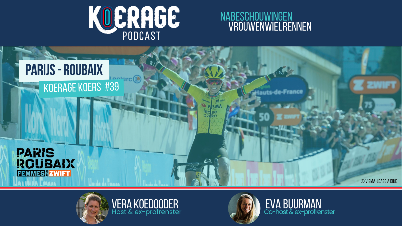 Voormalig professioneel wielrensters Vera Koedooder en Eva Buurman troffen elkaar een half uurtje na de finish van Parijs-Roubaix voor vrouwen online voor Koerage Koers #39! De kasseienklassieker die pas voor de vijfde keer voor vrouwen werd verreden en waar Pauline Ferrand-Prevot op indrukwekkende wijze solo won! De Italiaanse Borghesi werd tweede en Lorena Wiebes klopte Marianne Vos voor de derde plek. Hoe hebben Vera en Eva naar de Hel van het Noorden gekeken? Met uiteraard ook weer de vaste rubrieken Koerage Moment en de Voorspellingen. Veel luisterplezier!