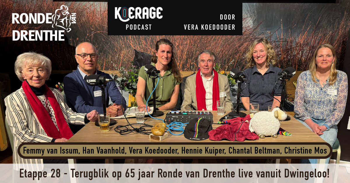 Na veel nabeschouwingen over het vrouwenwielrennen en shows van de hardloopreeks was het weer eens tijd voor een Etappe aflevering van de Koerage Podcast! Daar waar deze podcast eind 2021 mee begon. Olympiër en voormalig profwielrenster Vera Koedooder ging op zaterdag 5 april in Grand Café de Brink in Dwingeloo op de reünie avond van de Ronde van Drenthe in gesprek met de ‘koningin van Drenthe’ Femmy van Issum, Hennie Kuiper, Han Vaanhold, Chantal Beltman en Christine Mos. Het werd een terugblik op 65 jaar Ronde van Drenthe, de iconische koers die helaas sinds dit jaar niet meer bestaat in wedstrijdvorm.