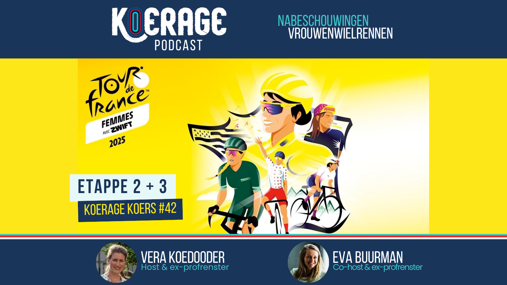 Voormalig professioneel wielrensters Vera Koedooder en Eva Buurman troffen elkaar na de derde etappe van de Tour de France Femmes online om de tweede en derde etappe te bespreken voor Koerage Koers #42! Vera vanuit huis en Eva zat weer thuis in Ouderkerk a/d Amstel. Deze week zullen ze bijna iedere dag de etappe(s) nabeschouwen en dit wordt mede mogelijk gemaakt door Liv Cycling Benelux! Ook is er weer een te gekke winactie: Luister snel in deze show hoe je een witte LIV jongerentrui kunt winnen. Gesigneerd door de winnares! Ook zitten de vaste rubrieken Koerage Moment en de Voorspellingen er weer in. Veel luisterplezier!