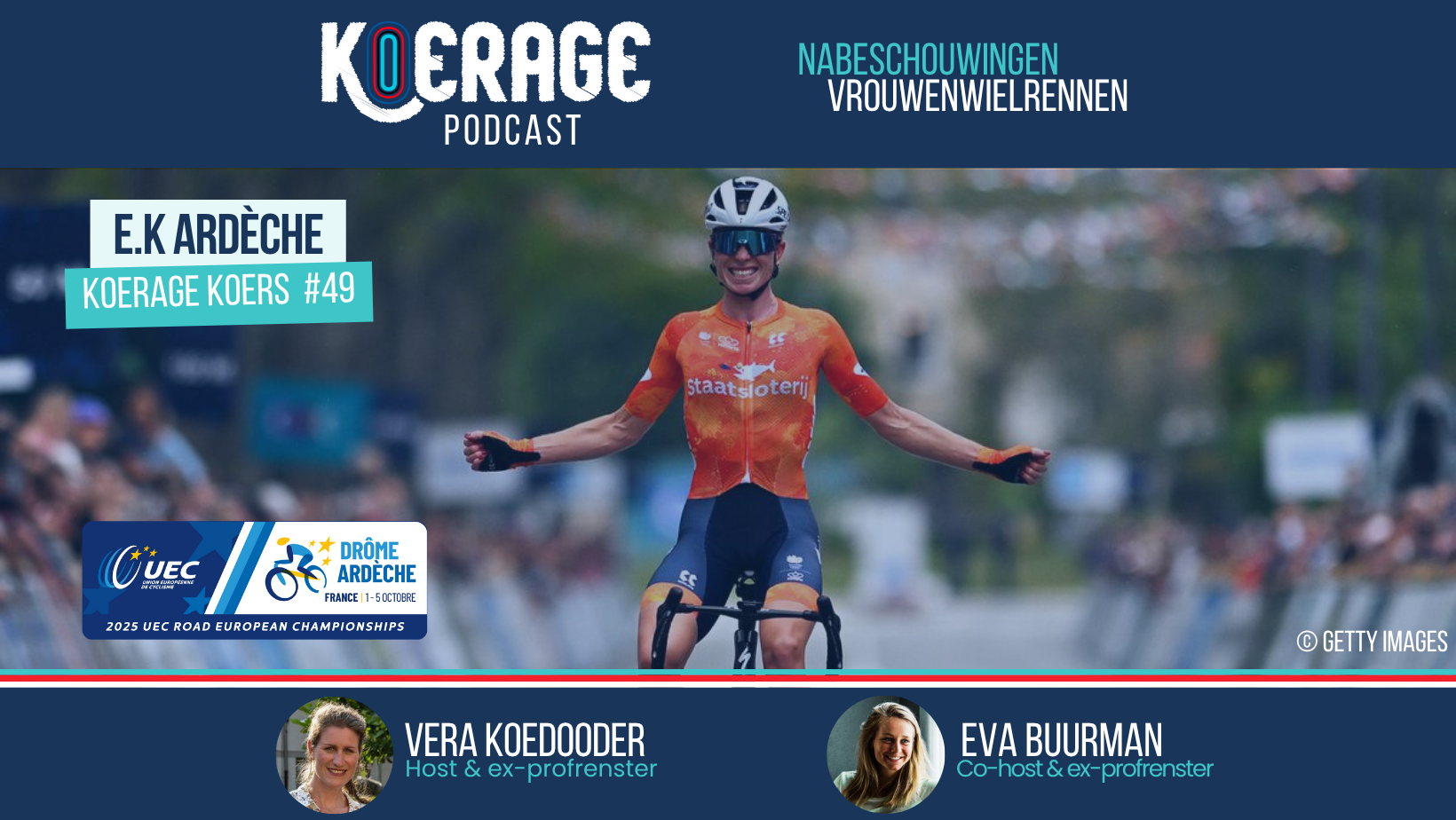 Een week na de wereldkampioenschappen in Kigali/ Rwanda stond er alweer het Europees kampioenschap op de weg in Frankrijk op het programma! Voormalig professioneel wielrensters Vera Koedooder en Eva Buurman troffen elkaar direct na de finish van het E.K Weg voor de vrouwen online voor Koerage Koers #49! Lovende woorden voor Demi Vollering (goud), Anna van der Breggen (brons) en TeamNL want zij reden een perfecte koers! Wat waren voor de Koerage momenten voor Vera en Eva? Veel luisterplezier!