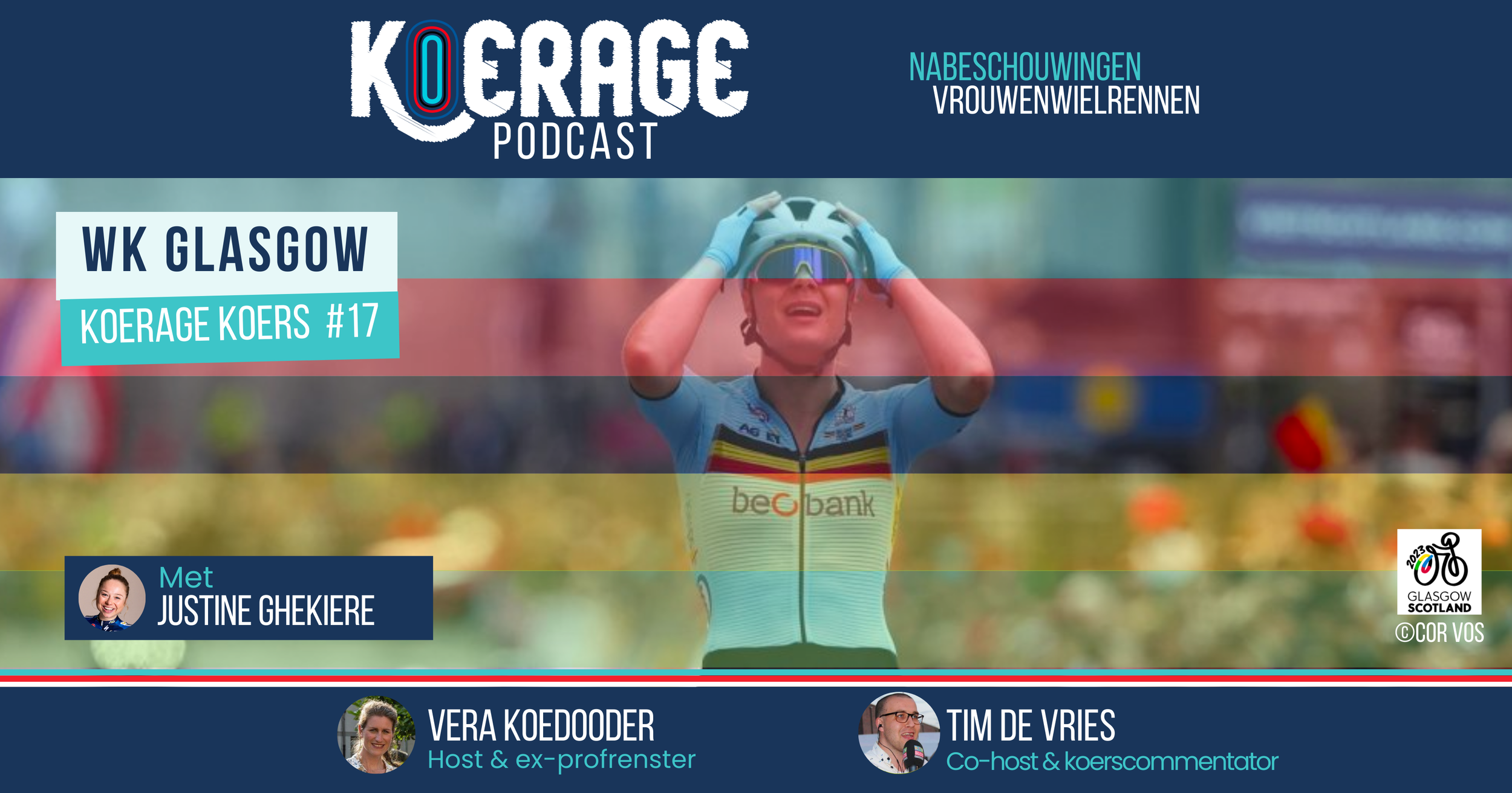Het Super W.K. Wielrennen zit erop! Na drukke weken met werkelijk alle disciplines van het wielrennen was de wegwedstrijd van de vrouwen het toetje. En wat voor een! Vera praat de avond na het W.K. na met Eurosport/Discovery+/GCN commentator Tim de Vries. De Belgische Justine Ghekiere is de belgast vanuit haar hotel in Glasgow. Zij reed vandaag een supersterke wedstrijd in dienst van winnares Lotte Kopecky! Lotte was een van de topfavorieten, bleek weer eens de sterktste en kwam solo aan. Zilver was er voor de sterke Nederlandse Demi Vollering die ondanks kramp in de finale nog net Uttrup Ludwig uit Denemarken voorbij sprintte op de finish.